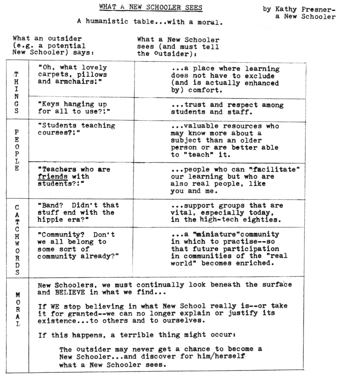 One semester, I facilitated a learning group and we put out three issues of a school newspaper, in the era just before desktop publishing became commonplace. We cut up typewritten newspaper articles, pasted them up with scotch tape, and photocopied and stapled them together. We ran a bake sale and car wash to raise funds for photocopy costs. I wrote this piece for one issue: