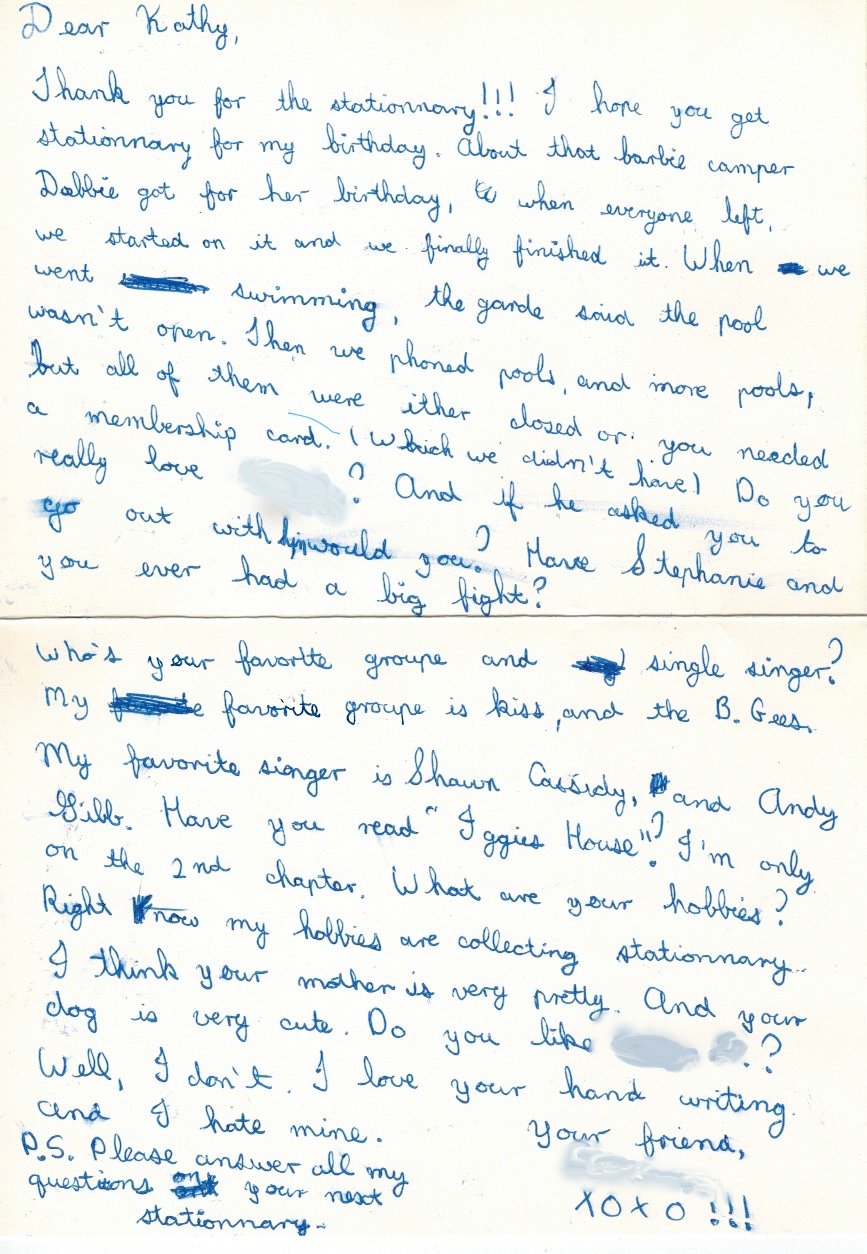 Who’s your favorite groupe and single singer? My favorite groupe is kiss, and the B. Gees. My favorite singer is Shawn Cassidy, and Andy Gibb. Have you read “Iggie’s House?” I’m only on the 2nd chapter. What are your hobbies? Right now my hobbies are collecting stationnary. I think your mother is very pretty. And your dog is very cute. Do you like [another boy’s name]? Well, I don’t. I love your hand writing. And I hate mine.
