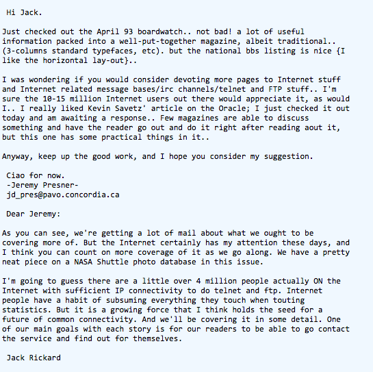 Jeremy recently dug up a couple of 1993 letters to the magazine’s publisher Jack Rickard, which I find fascinating.
